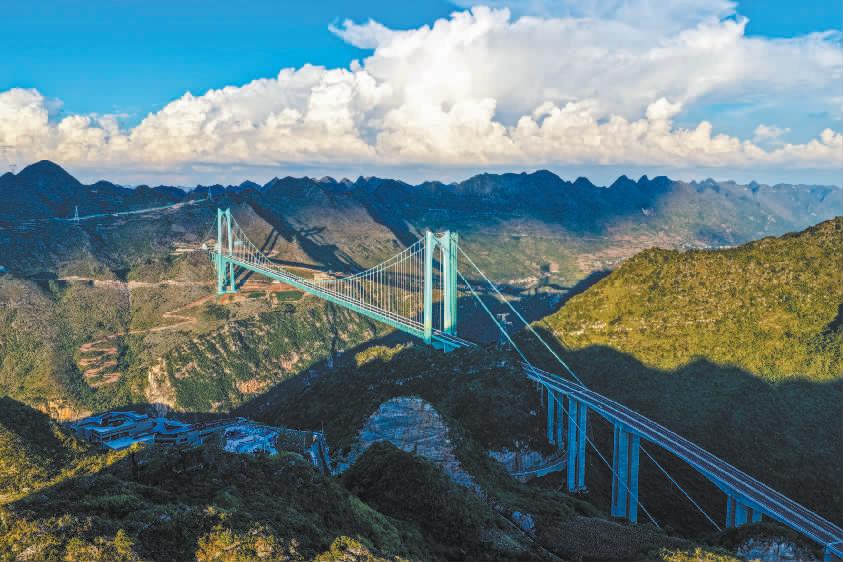 9月 28日,世界第一高桥——贵州花江峡谷大桥建成通车。图为蓝天白云下的贵州花江峡谷大桥。