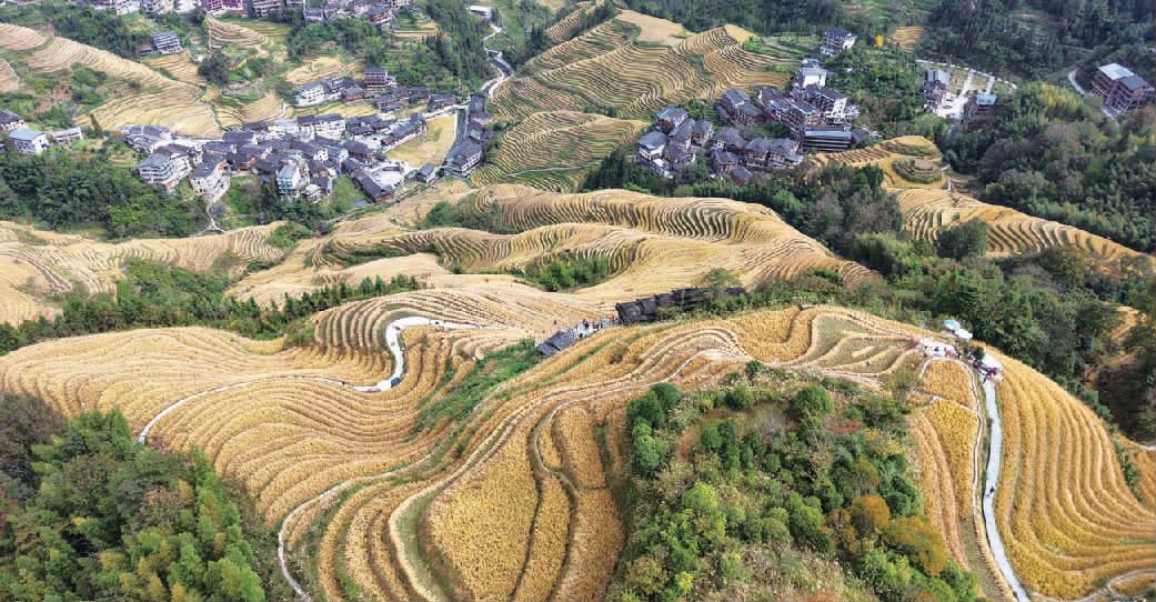 日前,广西壮族自治区桂林市龙胜各族自治县龙脊镇大寨村种植的水稻进入收获季节。龙脊梯田既解决粮食自给,又守护生态与民族文化。数据显示,高山梯田能有效减少水土流失,每年拦截泥沙量达数万吨,为下游生态安全提供保障,被称为“绿色谷仓”。 新华社供图