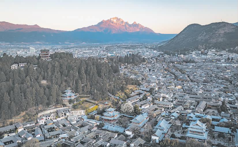 近年来,云南省丽江市深入践行绿水青山就是金山银山理念,扛牢扛实生态优先、绿色发展政治责任,推动美丽丽江建设不断取得新成效。近期,丽江古城内游客逐渐增多,景区即将迎来冬季旅游高峰。图为丽江古城和远处的玉龙雪山。
