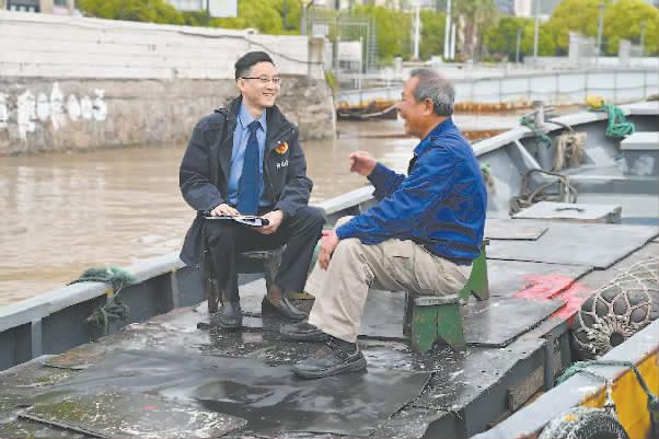 陈俊向“海上的士”船老大了解情况。 舟山市生态环境局供图