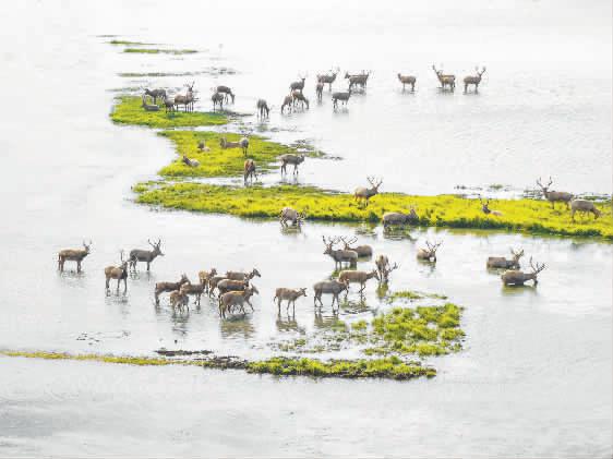 在大丰麋鹿国家级自然保护区,一群麋鹿正在水塘边嬉戏,呦呦鹿鸣回荡于广袤湿地。作为我国最早建立的麋鹿自然保护区,如今,大丰麋鹿种群数量持续攀升,已突破8500头,其中野生麋鹿超过3600头,占全球总量60%以上。2023年,中国黄(渤)海候鸟栖息地(第二期)扩展列入《世界遗产名录》,盐城滨海湿地成为中国首个滨海湿地类型世界自然遗产。