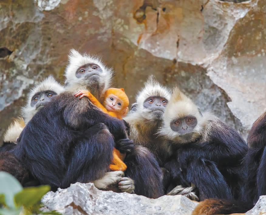 广西崇左喀斯特石山间的白头叶猴。