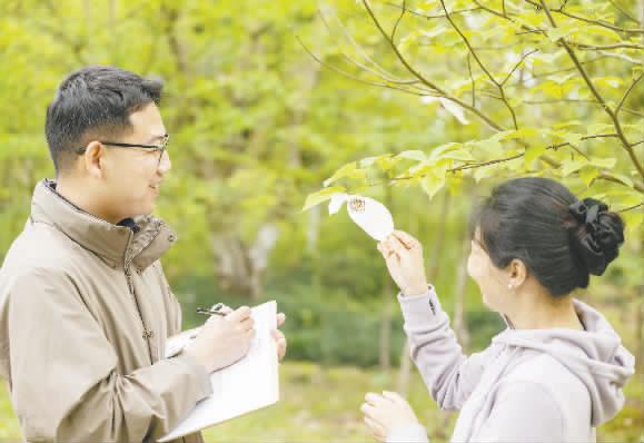 近日,在湖北省宜昌市长江珍稀植物培育基地,从高海拔地区抢救引种的珙桐子代植株首次实现大规模开花。图为工作人员观察记录珙桐开花情况。 新华社供图