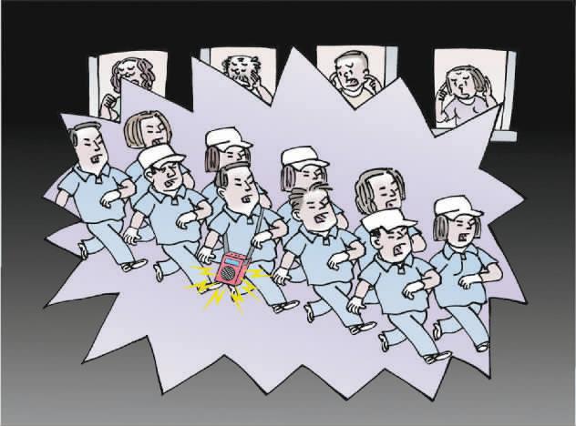 清晨五六点就在街道上列队行进锻炼身体,伴随着大声播放的热闹音乐声,“炸”醒仍在睡梦中的周边居民。最近,个别地方出现了这样的“暴走团”,终因噪声扰民被街道办约谈,要求其暂停活动。蒋跃新制图