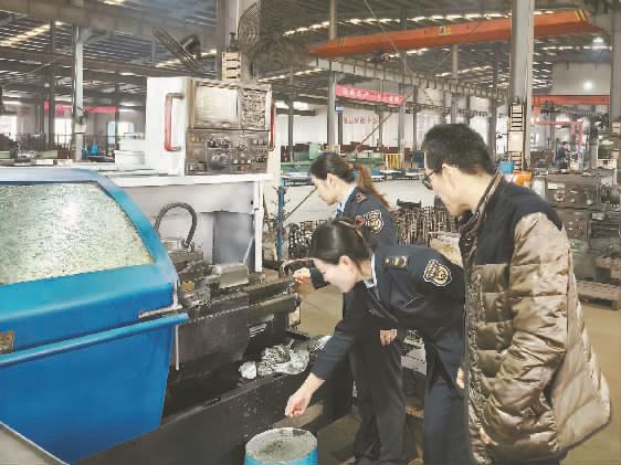 山东省威海市以生态环境执法大练兵为抓手,不断强化执法监管、优化指导帮扶,在全省率先推行执法进门“四告知”和行政处罚“五书同递达”制度,以暖心执法助力企业绿色发展。图为威海市生态环境局荣成分局执法人员现场查看企业污染治理设施运行情况。 殷浩然摄