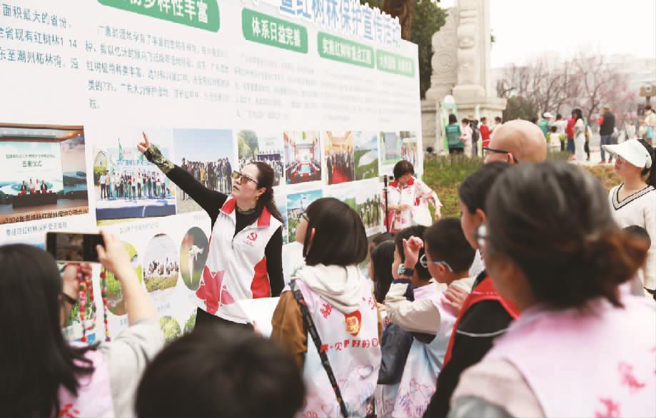 2月16日,2025年广东省“世界湿地日”暨红树林保护宣传活动在广州海珠国家湿地公园举行。活动现场发布2024年广东省重要湿地名录及“小微湿地+”“湿地公园+”试点建设名单,并举行全球新物种“海珠微瓢虫”发布仪式。图为科研人员在活动现场向观众科普湿地与红树林保护的知识。新华社供图