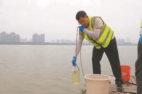 图为生态环境监测人员正在进行取样。