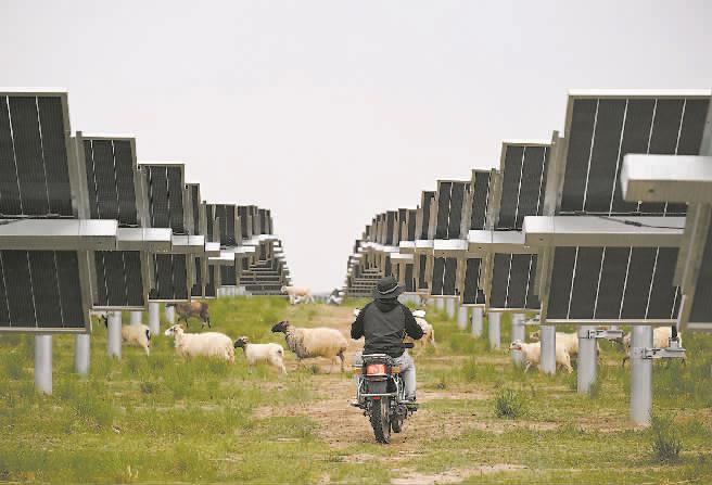 位于青海省海南藏族自治州共和县的光伏产业园,积极探索“光伏+生态治理+生态牧业”的产业融合发展模式,推动清洁能源与环境保护深度融合,将昔日荒滩变成牧场。图为牧民在光伏产业园放羊。 新华社供图