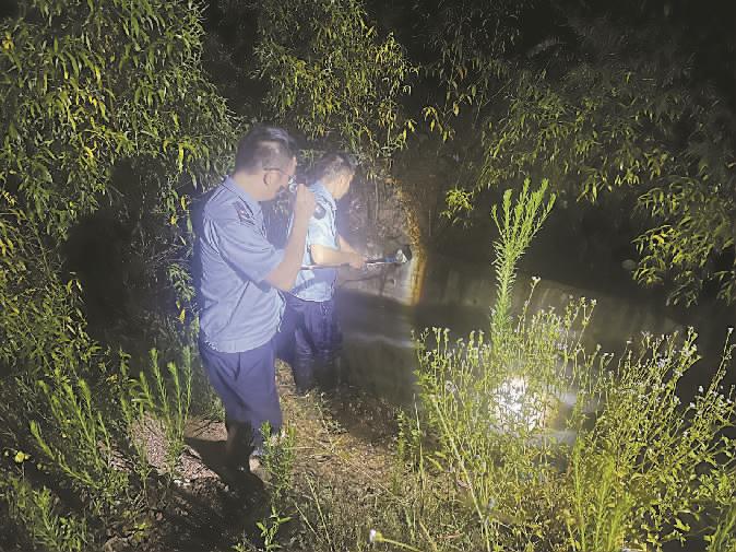为防范强降雨带来的环境风险,保障重点流域水环境安全,近日,江西省赣州市信丰生态环境局利用夜查、非现场执法等方式,加大环境风险隐患排查力度。图为赣州市生态环境保护综合执法支队信丰大队执法人员夜间对某入河排污口开展采样工作。 施界 钟小明摄影报道