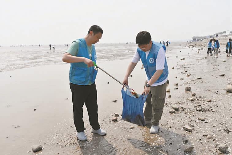 图为天津市滨海新区“美丽海湾志愿有我”生态环境志愿服务活动现场,志愿者们开展洁净岸滩行动。