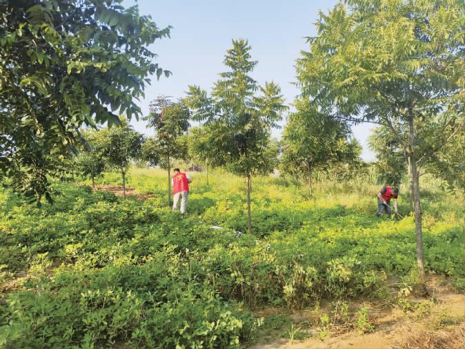 眼下正值初秋,在安徽省天长市金集镇草西村的薄壳山核桃绿色生态示范种植基地,天长市草西特色种植专业合作社负责人张兴美弓着腰,在山核桃林地里穿梭忙碌着。他一会儿用手整理着山核桃的枝条,一会儿蹲下身抚摸着茂密的花生叶苗。