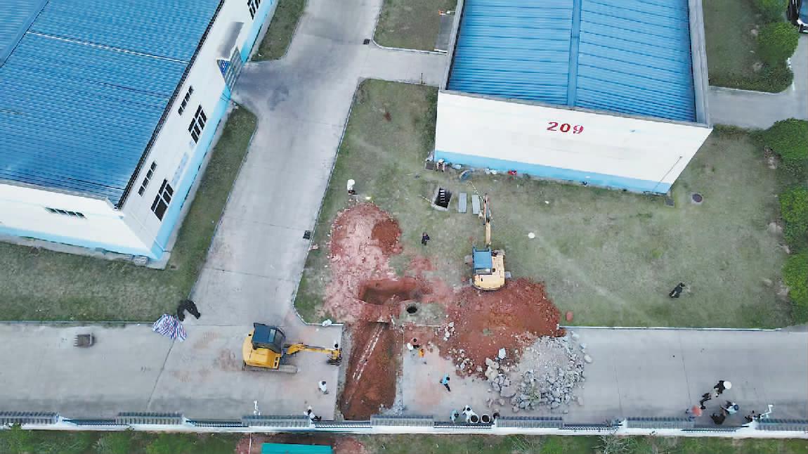 开挖没多久,暗管探测仪探测到的两根白色PVC管便显露出来。其中一根套有强电电缆线,另一根空置备用。这两根PVC管从209车间西侧电缆观察井横穿厂区过道至围墙外,中途与厂区雨水管道交汇。交汇处的雨水管道是一根直径约60cm的黑色波纹管,且波纹管底部已破损。