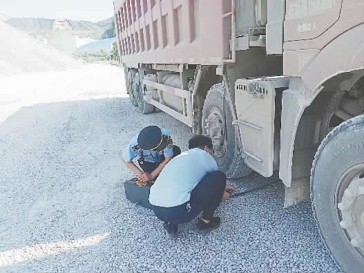 吉林市生态环境局磐石市分局执法人员在高温下开展重型柴油车抽检专项行动。 霍晓 顾海瑶摄