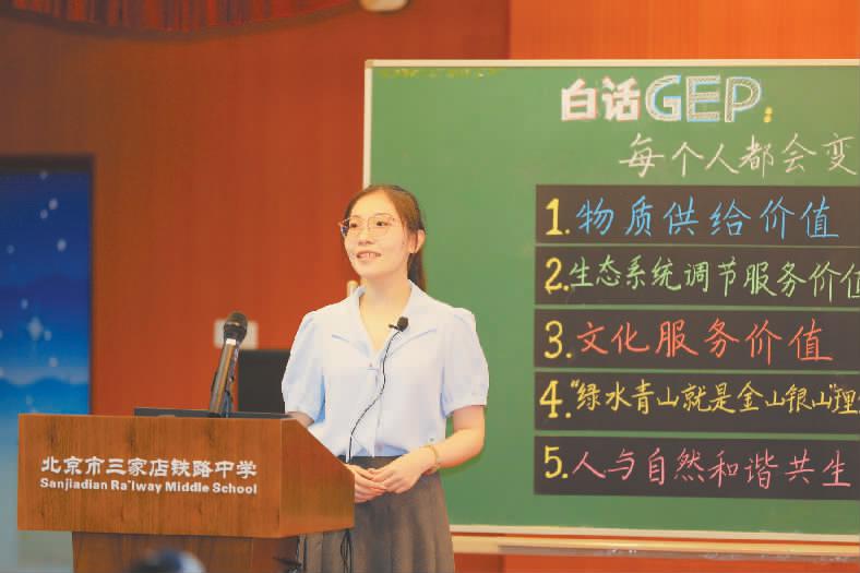 “一棵树除了盖房子、结果实,还有什么价值?让我们一起从生态角度把一棵树的价值完整画出来。”在北京市门头沟区三家店铁路中学的“开学第一课”上,生态产品总值(GEP)概念被巧妙融进一堂特殊的“生态美术课”。北京市门头沟区生态环境局工作人员崔婧雯化身“教师”,带领孩子们完成了对GEP从抽象概念到具体理解的跨越。崔婧雯的课堂还聚焦“两山”理念20年来给门头沟区带来的点滴变化。这里的黑河沟从“煤渣污水沟”变为“网红打卡地”,让同学们深切感受到生态文明建设并非遥远的口号,而是正在家乡发生的生动实践。