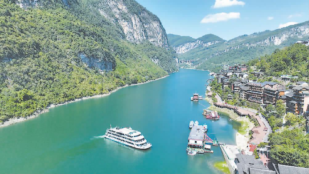 在重庆市酉阳土家族苗族自治县龚滩古镇,鳞次栉比的土家吊脚楼与一江碧水、绝壁峡谷和往来船只构成一幅山水画卷。 新华社供图