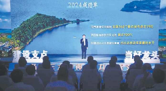 武汉市生态环境局党组书记、局长张朝辉在“打造美丽中国先行区建设示范标杆 整体提升战略支点生态承载力”主题报告会上作报告。