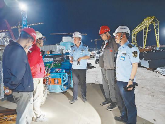 图为执法人员突击夜查高风险移动放射源探伤作业现场。