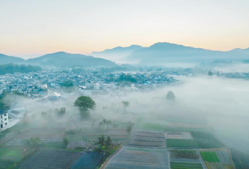 场景:日出前后,上庄镇旺川村出现了平流雾景观,村落、田野和山峦在薄雾中若隐若现,构成一幅迷人的秋景图。 周斯跃摄