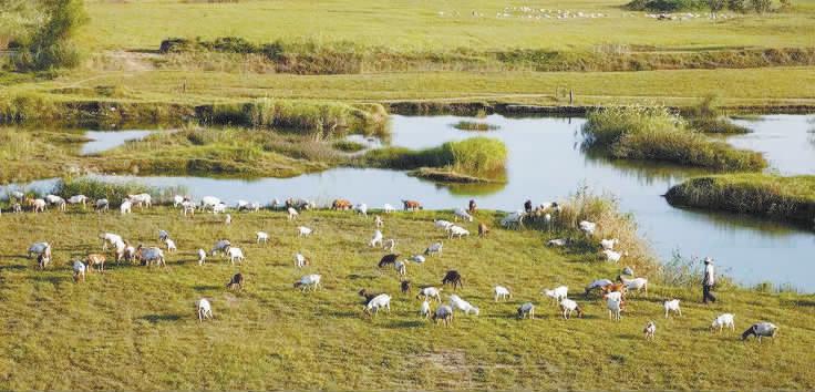 骆马湖入湖口的滩涂之上,羊群如云团般铺展在湿地间。