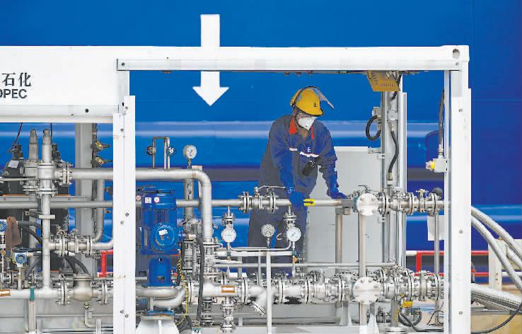 甲醇双燃料动力汽车滚装船“港荣”轮日前靠泊天津港环球滚装码头,并进行了300吨国产绿色甲醇岸基加注作业,这标志着天津港已具备规模化供应绿色甲醇能力,加注所用甲醇产自内蒙古自治区,原料为废旧轮胎和生物质,本次作业可减排二氧化碳460吨。 新华社供稿