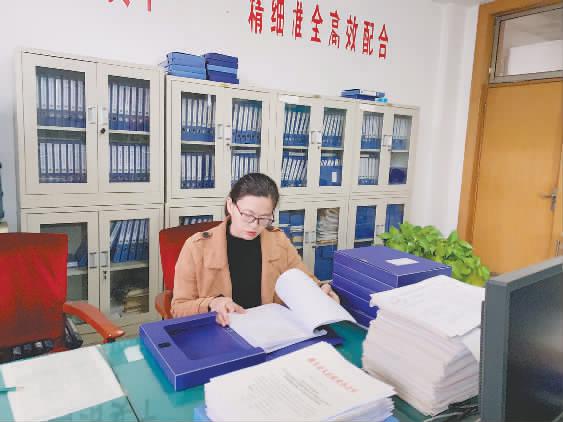 图为曹海霞正在审核整理国家生态市创建材料。 吴运刚摄