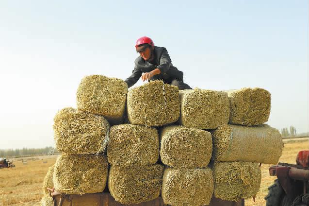 新疆维吾尔自治区阿克苏地区阿瓦提县近年来大力推广农作物收割打捆一体化作业,将打捆回收的秸秆通过制成畜牧饲料、燃料等方式变废为宝,提高秸秆综合利用率,既保护了生态环境,又增加了农民收入。图为阿瓦提县塔木托格拉克镇塔木托格拉克村村民将成捆的小米秸秆装车回收。 包良廷摄