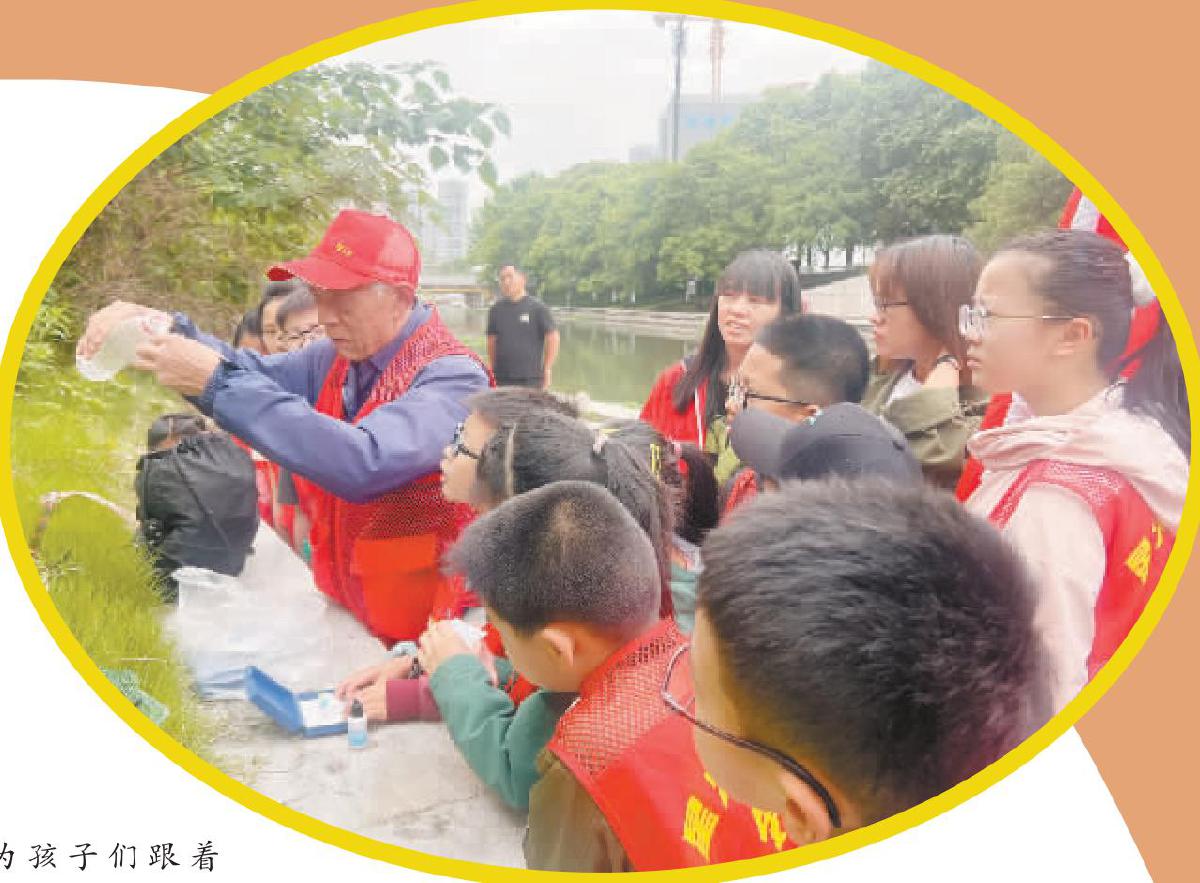 ▶图为孩子们跟着“胡爷爷”去巡河。