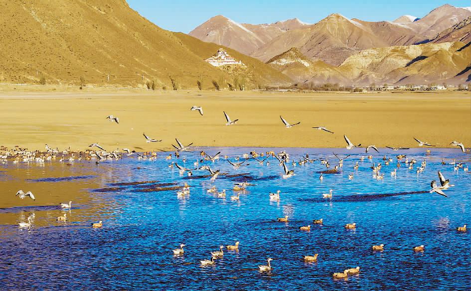 西藏自治区拉萨市林周县近期迎来大批越冬候鸟,黑颈鹤、斑头雁、赤麻鸭等候鸟在河谷、湖泊觅食休憩。