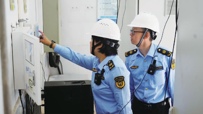 图为上海市金山区生态环境局执法人员接到信访投诉后,在企业站房核查排污在线监测数据是否真实准确。 高志煌摄