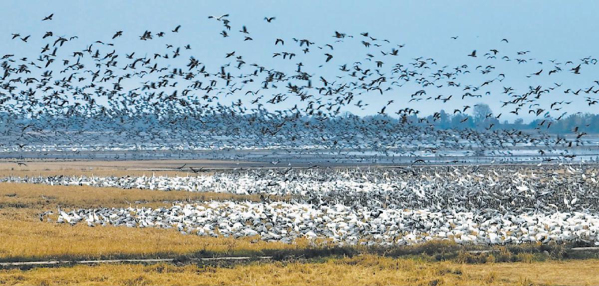 初冬时节,鄱阳湖白鹤洲水天寥廓,万鸟翔集。这背后,是当地持之以恒的生态守护。为了留住这些远方的“客人”,近年来,江西省上饶市余干县投入3000余万元建设智慧监控系统,守护湿地安全;每年拿出近百万元,精心预留千亩稻田作为“候鸟食堂”;以科技手段校准稻谷成熟期,确保食物充足安全。这些实实在在的举措,为候鸟营造了一个安心越冬的家园。江杨斌 颜志高摄影报道