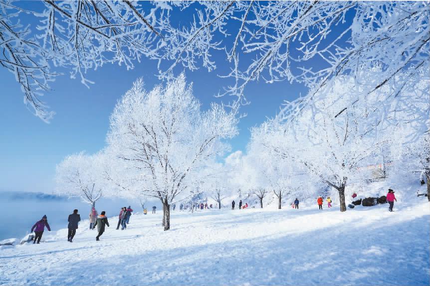 雾凇掩映下,吉林市松花江畔游人如织,人们共赏冰雪美景。 王进摄