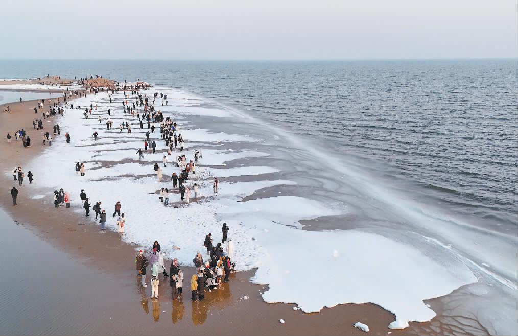 冬日里,河北省秦皇岛市海岸线出现结冰现象,吸引诸多游客前来观赏。图为游客在秦皇岛市北戴河区海边游玩。