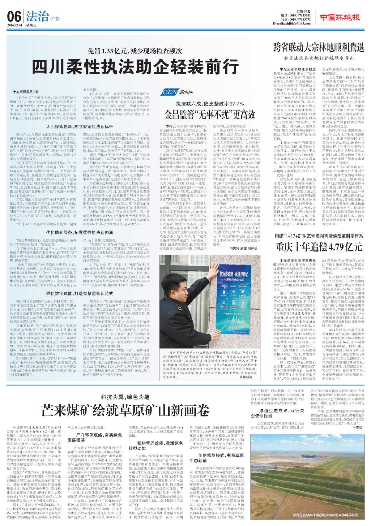 陈力介绍,为持续优化营商环境,四川在全国率先出台《全省生态环境保护执法系统关于“规范涉企检查 优化营商环境”的12条措施》,指导各地细化落实,并推广泸州“数字环保门诊”、自贡“综合查一次平台”、眉山“小过不罚”、达州“一表通查”等创新做法,实现执法效能与企业获得感同步提升。