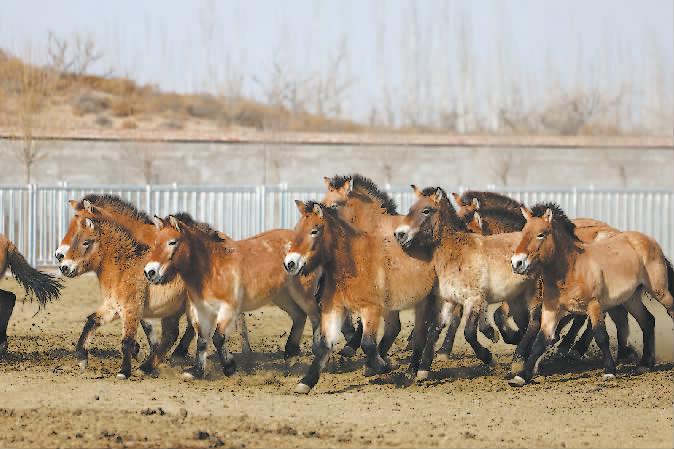 普氏野马是国家一级保护动物、全球濒危大型野生动物,曾一度在野外绝迹。为拯救这一珍稀物种,1985年我国启动“野马返乡”计划,陆续从国外引回普氏野马,在新疆、甘肃等地繁育,并进行野化放归试验。历经近40年科学保护与系统繁育,国家林业局甘肃濒危动物保护中心普氏野马种群数量稳步增长,遗传多样性水平持续提升。截至目前,已累计向敦煌西湖国家级自然保护区野化放归野马56匹,现存栏野马45匹。 新华社供图
