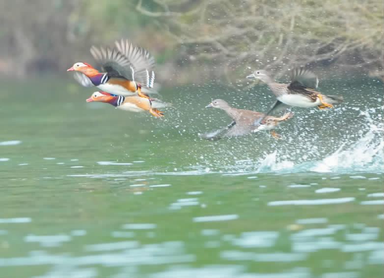 湖南省衡阳市近年来持续加强生态环境保护,洣水流域水清岸绿,湿地生态不断改善,为候鸟提供了优质栖息地。图为几只鸳鸯在衡东县杨林镇洣水河水面嬉戏飞翔。 新华社供图