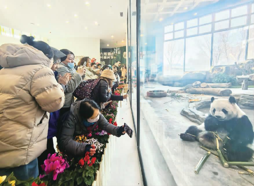 2月19日,新疆维吾尔自治区乌鲁木齐水上乐园大熊猫馆开启试运营。两只来自中国大熊猫保护研究中心的大熊猫“宝元”和“德瑞”,经过一段时间的适应,正式与游客见面。图为游客在观看大熊猫“宝元”。新华社供图