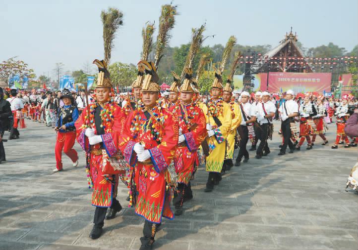 近年来,云南省德宏傣族景颇族自治州坚持走生态立州的路子。在加强生物多样性保护的同时,更加注重“旅游+”的发展,走出了一条人与自然和谐共生、文化与经济共同繁荣的可持续发展路径。图为2026年芒市目瑙纵歌节活动现场。邓佳摄