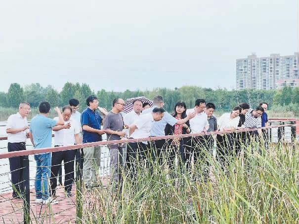 图为2023年7月20日,民革中央监督调研组在湖北省鄂州市就青天湖水系综合治理项目开展调研。