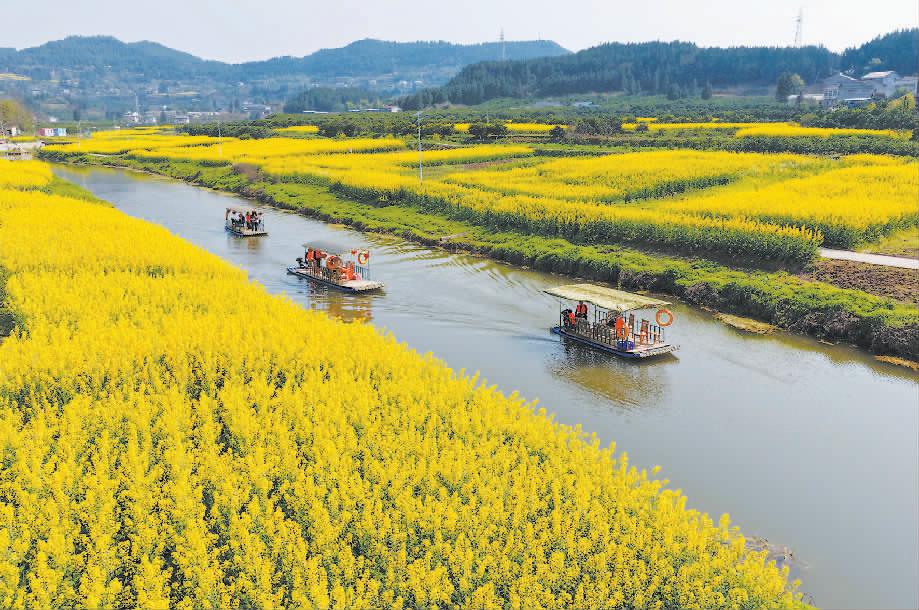近年来,四川省南充市蓬安县按照居民出行“300米见绿、500米入园”的要求,均衡布局城市公园绿地,加大小绿地、小游园、小憩园建设力度和覆盖面,不断增强群众生态环境获得感。图为游客在蓬安县正源镇石牛村乘坐游船赏花游玩。新华社供图
