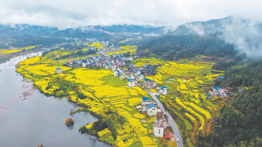 近日,湖南省怀化市通道侗族自治县县溪镇老湾村数百亩油菜花绽放,呈现出一派水清岸绿、生态宜居的美丽景象。近年来,通道侗族自治县大力推进乡村振兴战略,推广“油菜+优质稻”产业轮作种植模式,助力农业增产、农民增收。 李尚引摄