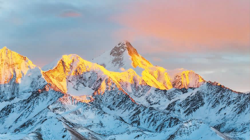 夕阳西下,贡嘎雪山仿佛披上了金色的外衣,又似一座黄金浇筑而成的宫殿,整座雪峰在余晖映照下熠熠生辉,显得壮美绝伦。 本报见习记者赵晓宇摄