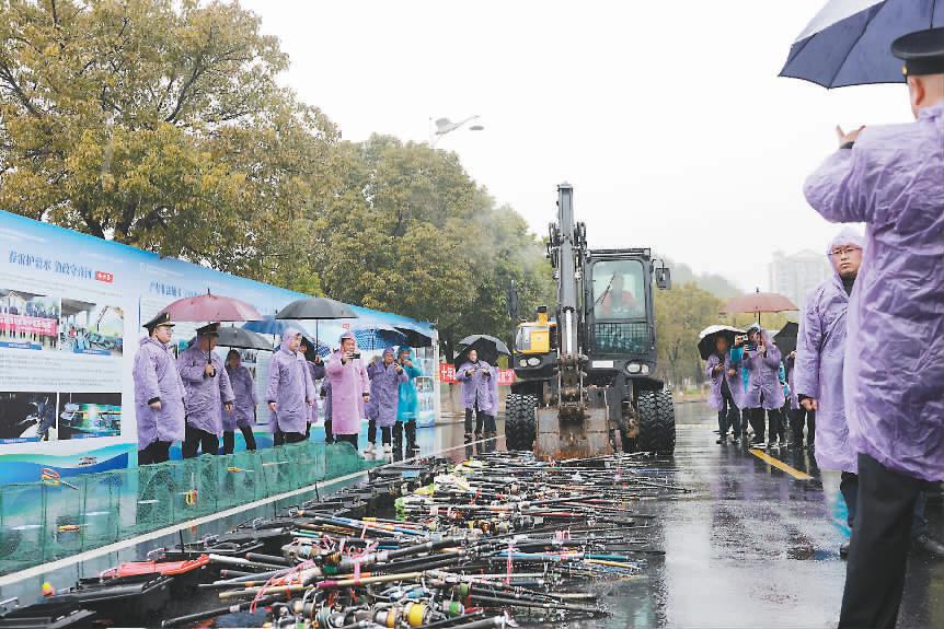江西省九江市近日开展2026年“春雷”百日护渔联合执法行动暨非法捕捞渔具集中销毁行动。工作人员对2025年以来全市收缴的1万余根钓竿、300余张渔网等非法渔具,严格按无害化处理流程进行集中销毁,以实际行动打响春季护渔战。 王焰摄
