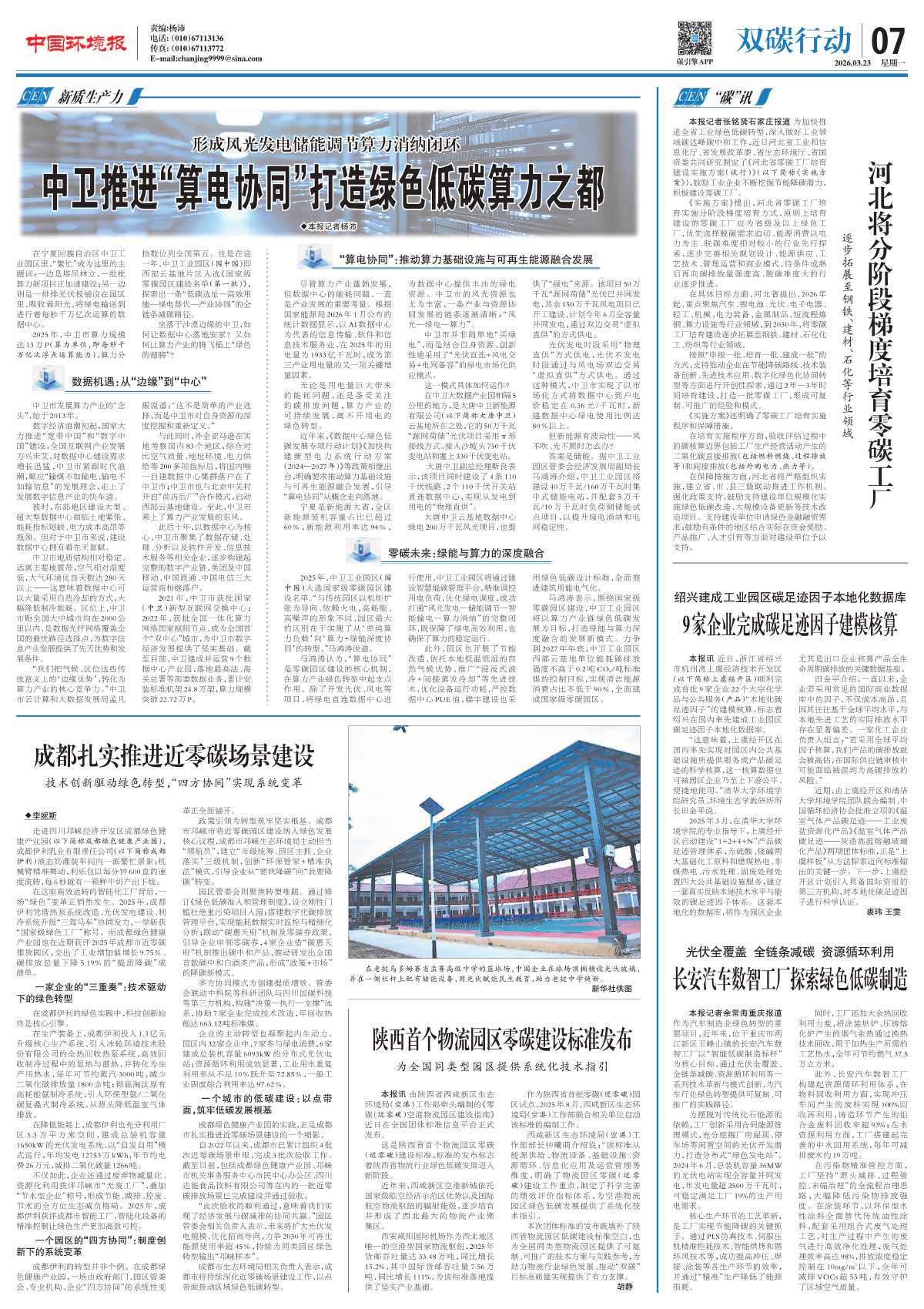 2025年,中卫市算力规模达13万P(算力单位,即每秒千万亿次浮点运算能力),算力分指数位列全国第五。也是在这一年,中卫工业园区(园中园)即西部云基地片区入选《国家级零碳园区建设名单(第一批)》,探索出一条“低碳选址—高效用能—绿电替代—产业协同”的全链条减碳路径。